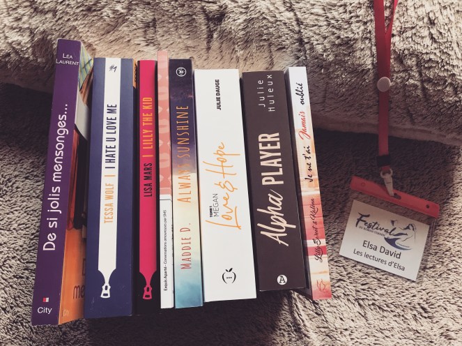 La journée s’est terminée par une grande séance de dédicaces durant laquelle on avait le droit de prendre sept livres gratuitement. Dans le sac du festival qu’on nous a donné en même temps que notre badge, on avait sept tickets pour retirer des livres auprès de chaque auteure. Je suis donc revenue avec ces romans. Ma PAL ne m’en remercie pas. Mais bon ce n’est pas tous les jours qu’on a le droit à des romans gratuits. Il fallait donc en profiter.